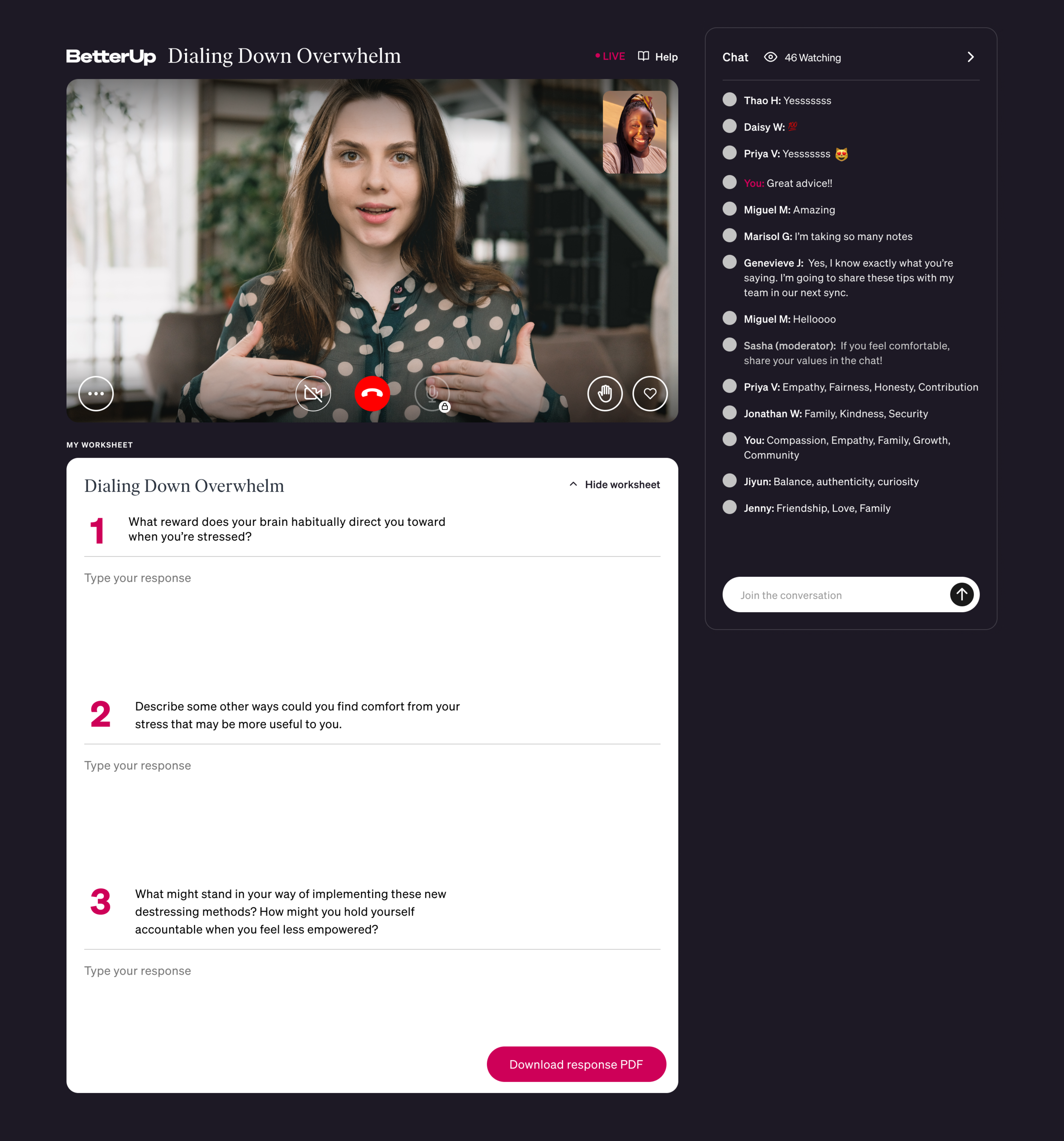 BetterUp, the world’s single largest coaching platform, helps organizations provide an evidence based approach to employee growth and leadership development. As part of this mission, Betterup collaborated with Pixelfat to create an experience called Workshops 3.0. Workshops is a coaching experience designed to reach a large live audience (300+ participants) in order to help team members work on various areas of self improvement.